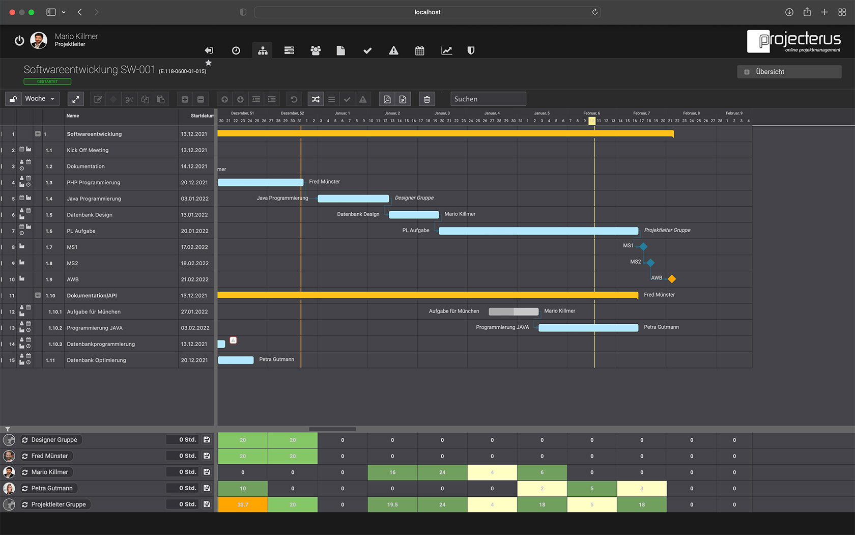 Mit projecterus behalten Sie jederzeit die Kontrolle über laufende Projekte. Mit der Erstellung eines Zeit- und Kostenplans strukturieren Sie Ihr Projekt und definieren u.a. Aufgaben, Verantwortliche, Zeitrahmen und Budgets. Das Multiprojektmanagement Modul zeigt übergreifend den aktuellen Stand der jeweiligen Projekte und möglichen bzw. nötigen Handlungsbedarf.