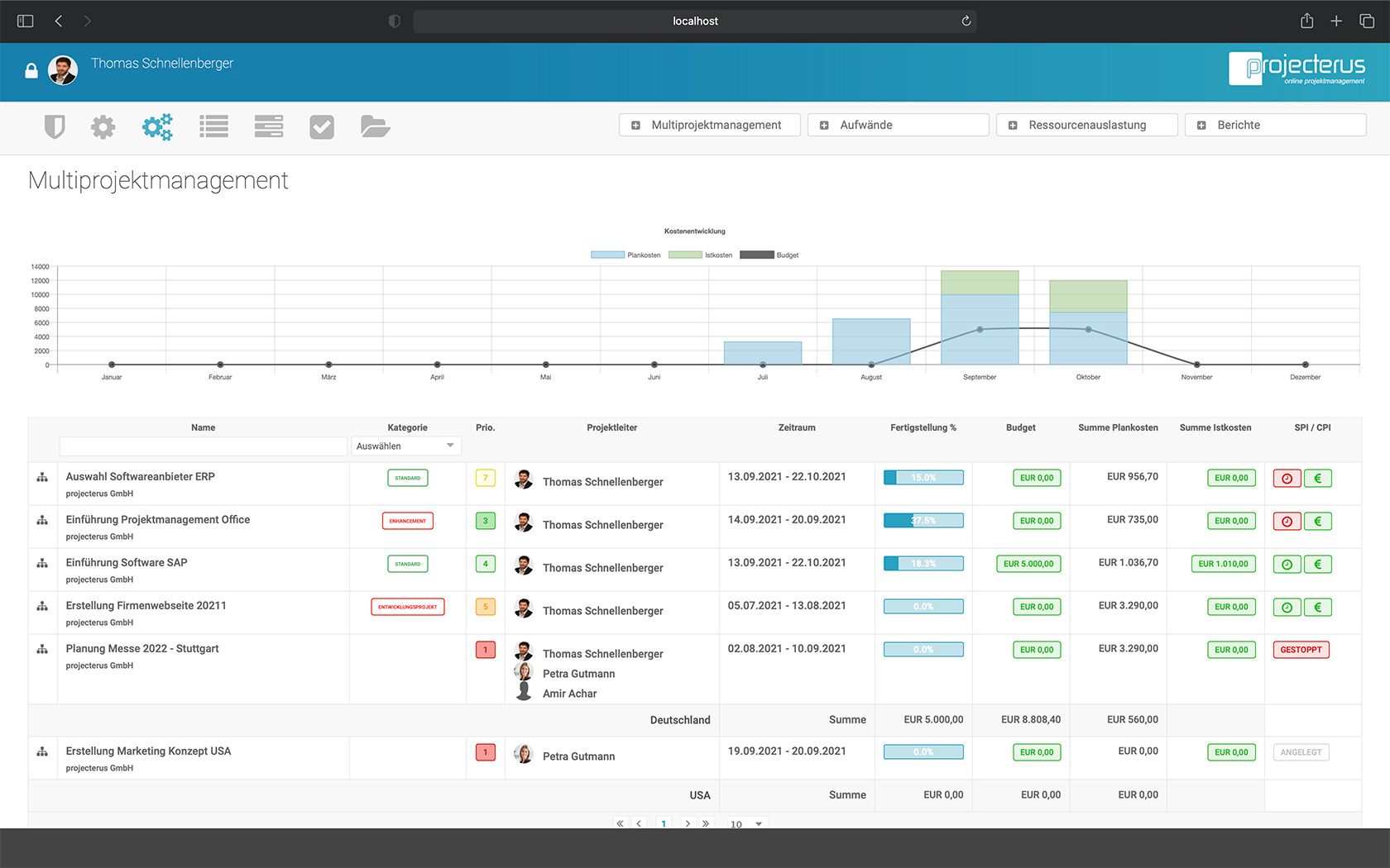 Mit projecterus behalten Sie jederzeit die Kontrolle über laufende Projekte. Mit der Erstellung eines Zeit- und Kostenplans strukturieren Sie Ihr Projekt und definieren u.a. Aufgaben, Verantwortliche, Zeitrahmen und Budgets. Das Multiprojektmanagement Modul zeigt übergreifend den aktuellen Stand der jeweiligen Projekte und möglichen bzw. nötigen Handlungsbedarf.